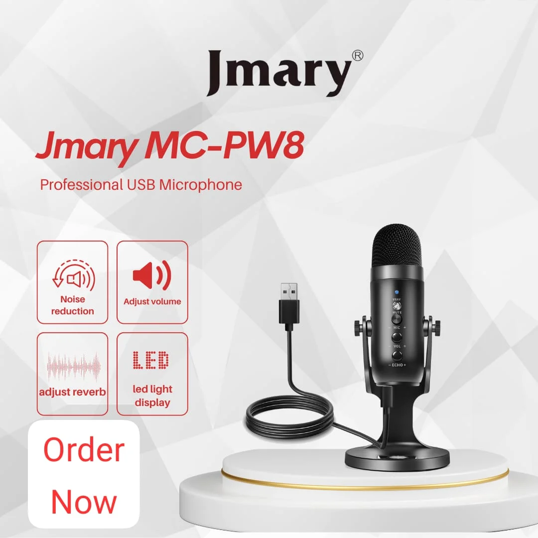 The Jmary MCPW8 Professional Condenser Microphone is a USB microphone designed for high-quality desktop recording. It features a cardioid polar pattern to capture sound from the front while reducing background noise, making it ideal for podcasts, voiceovers, and streaming. With its plug-and-play USB connection, it’s easy to set up on a computer. The microphone is also designed to deliver clear, detailed sound and is an affordable option for those needing a professional audio recording experience.